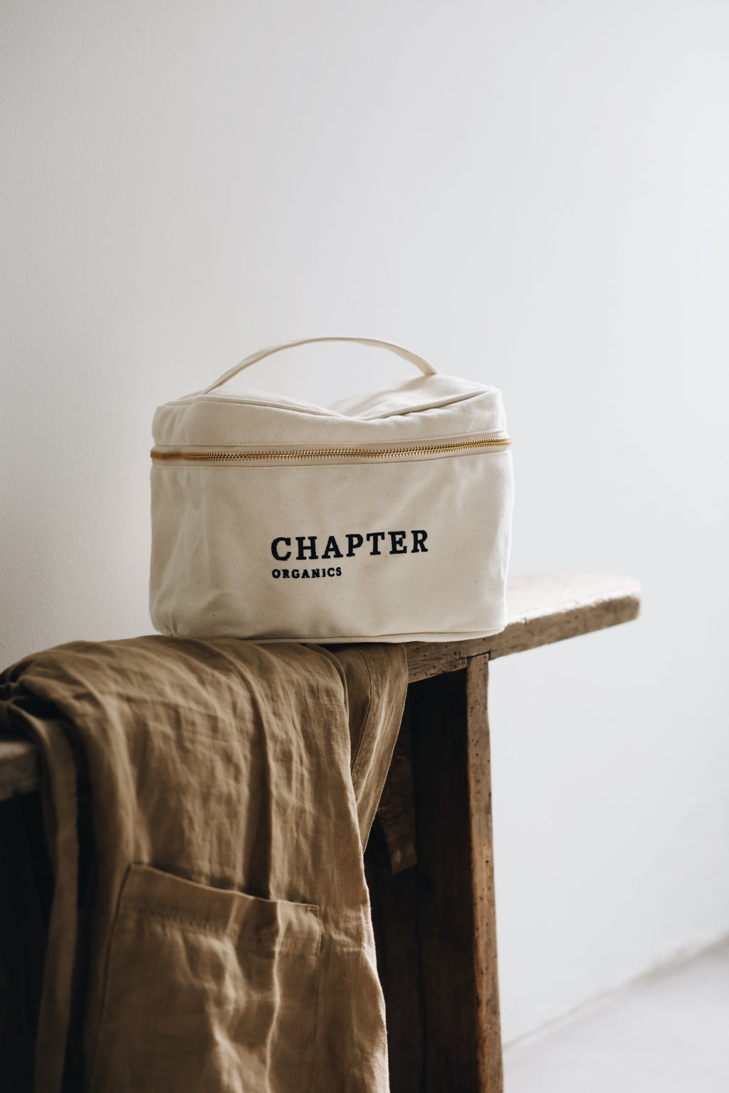 Finished with our soft cotton vanity cosmetic bag to keep your rituals beautifully stored at home or packed for weekends away.