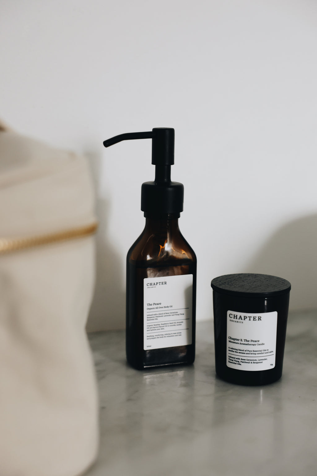 The Peace Body Oil, The Peace Minatare Candle and Vanity Cosmetic Bag